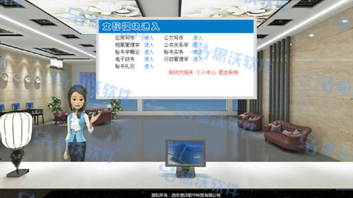 思(si)沃文(wen)(wen)秘(mi)(mi)虛擬仿真實(shi)訓系統是我公司依據文(wen)(wen)秘(mi)(mi)專業相關課(ke)程,結(jie)合(he)3D動態場景(jing)技術,引入實(shi)際文(wen)(wen)秘(mi)(mi)工(gong)作中的(de)相關案例,融合(he)開發的(de)一(yi)款(kuan)針對文(wen)(wen)秘(mi)(mi)專業實(shi)訓的(de)應用型教學(xue)平臺軟件。